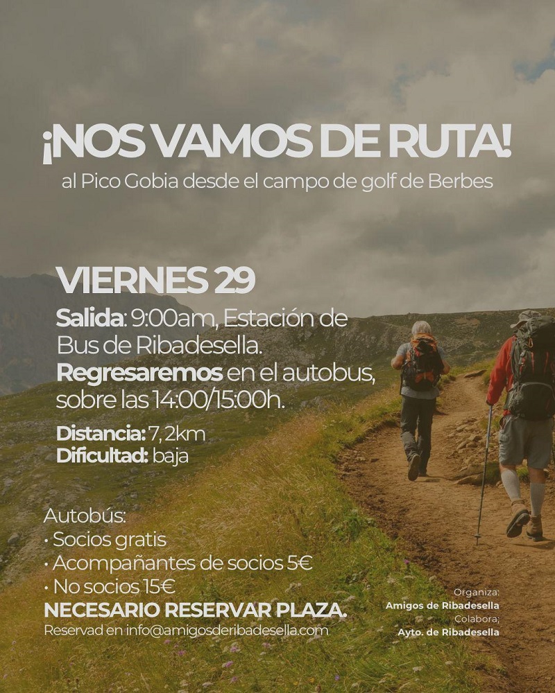 El próximo viernes, día 29, si el tiempo no lo impide, nos iremos de excursión al Picu Gobia. La salida la efectuaremos a las 9 horas desde la estación de autobuses y el recorrido será el siguiente: Campo de Golf Rasa de Berbes-Collado La Abierta-Picu Gobia-El Fabar-Campo de Golf. La duración será aproximadamente de 3 horas y 40 minutos. Se recomienda llevar ropa y calzado adecuados, agua y algo de refrigerio aquellos que lo necesiten.
